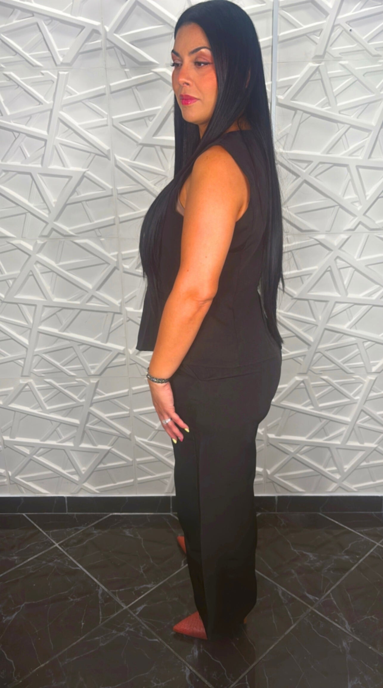 El Conjunto Amelia Negro es un conjunto de dos piezas que irradia elegancia sin esfuerzo. El chaleco con botones frontales añade un toque de sofisticación, mientras que el corte ajustado del corsé crea una silueta favorecedora.